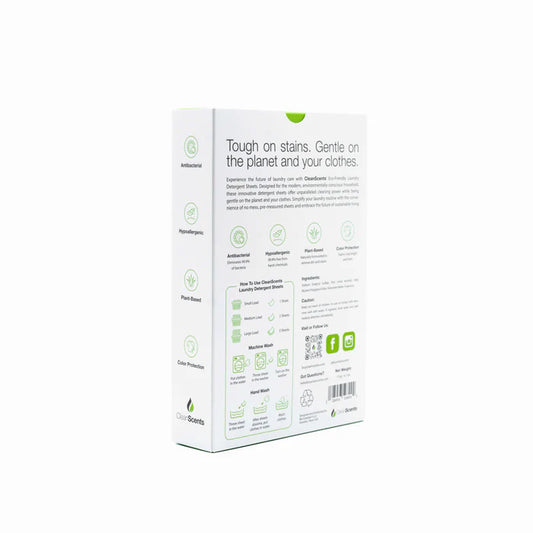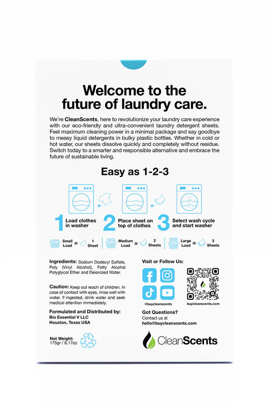 CleanScents revolutionizes your laundry care experience with eco-friendly, ultra-convenient and powerful cleaning laundry detergent sheets. Feel maximum cleaning power in a minimal package and say goodbye to messy liquid detergents in bulky plastic bottles. Switch today to a smarter and responsible alternative and embrace the future of sustainable living.