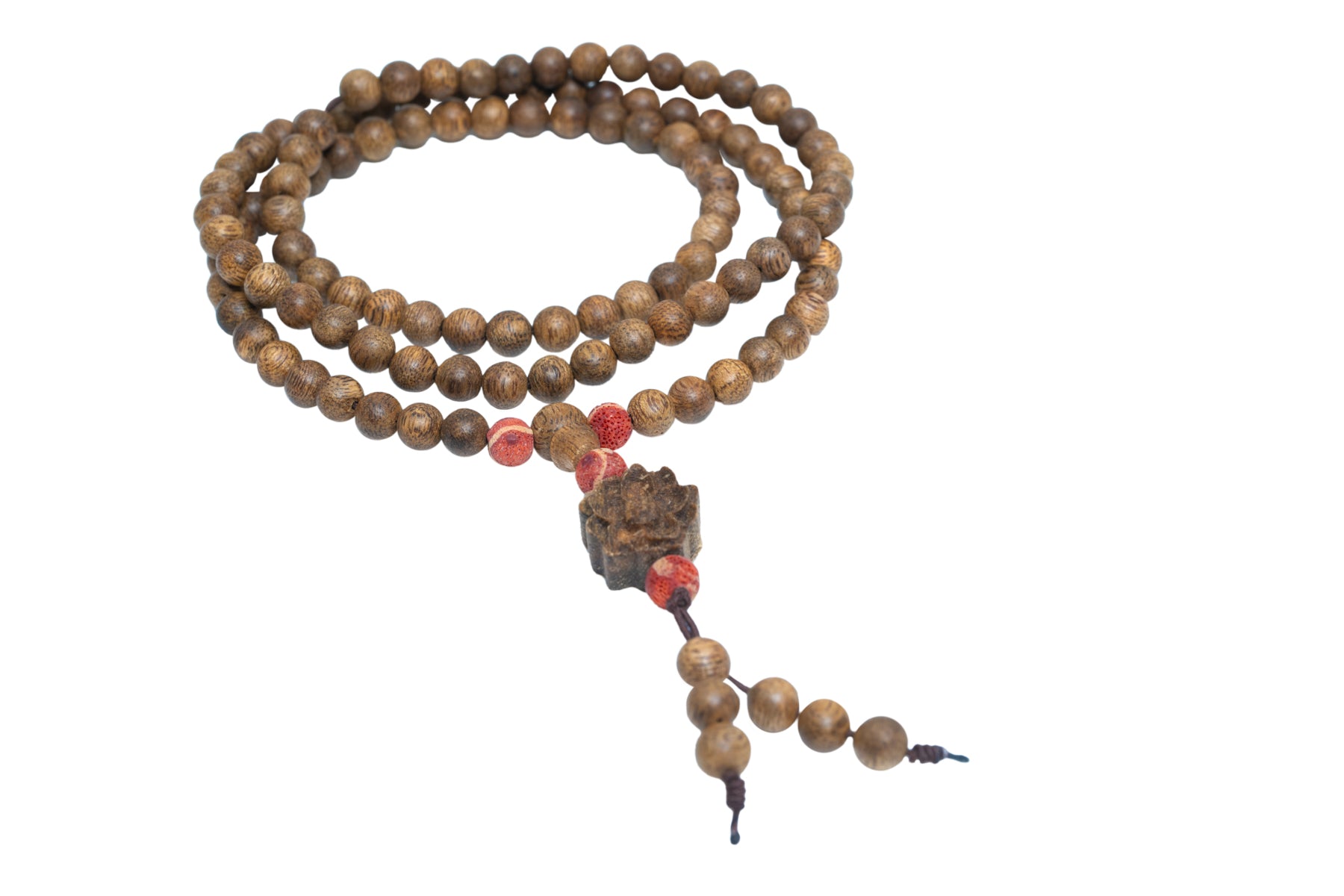Agarwood Necklace 108 with Red Coral and Lotus Charm (NL2)